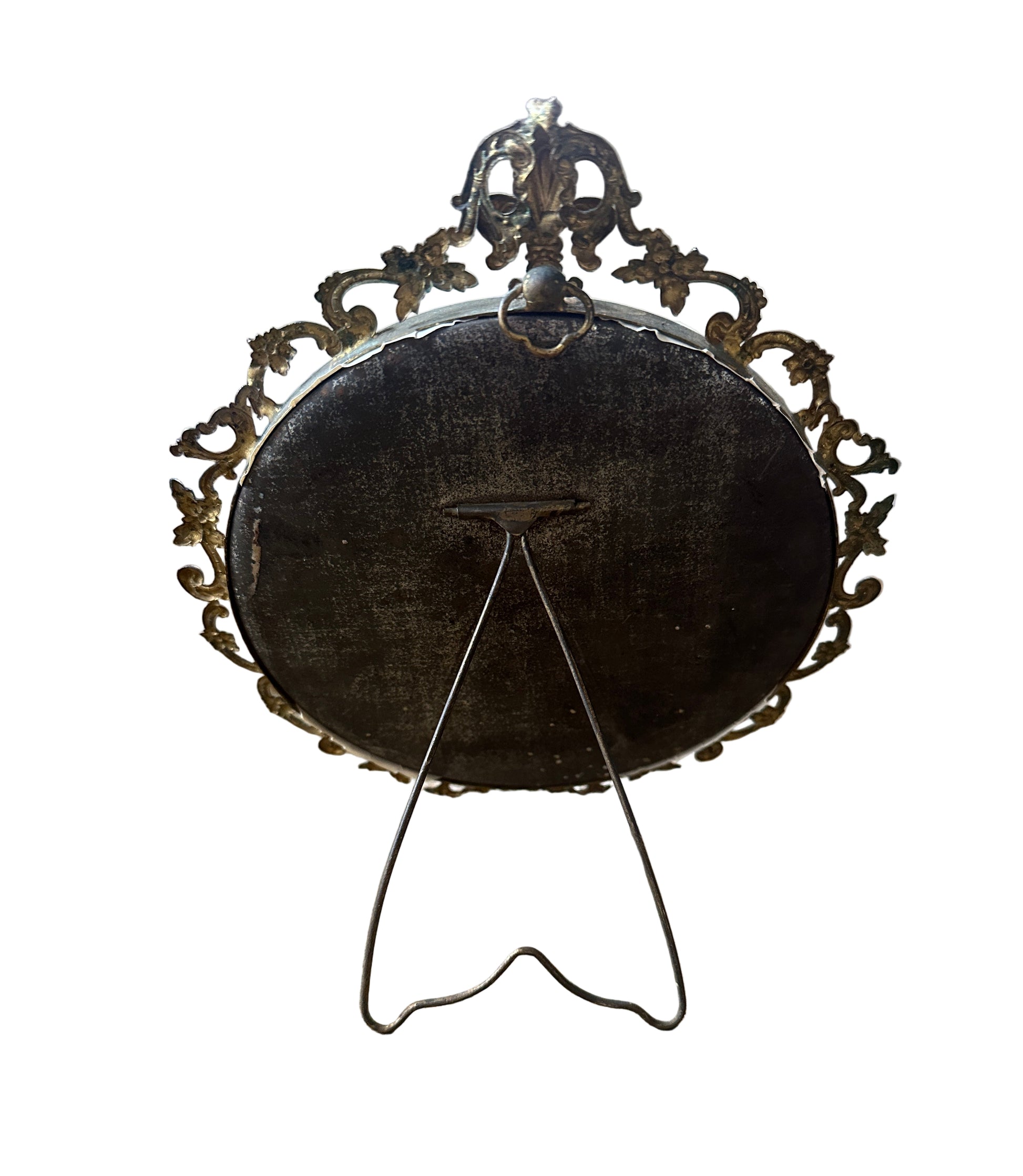This piece features a vintage ornate brass tabletop or wall frame with intricate openwork details scrolls, foliage motifs, and a crest-like flourish at the top characteristic of late Victorian to early 20th-century decorative styles. The metal has a naturally aged patina that adds warmth and authenticity.