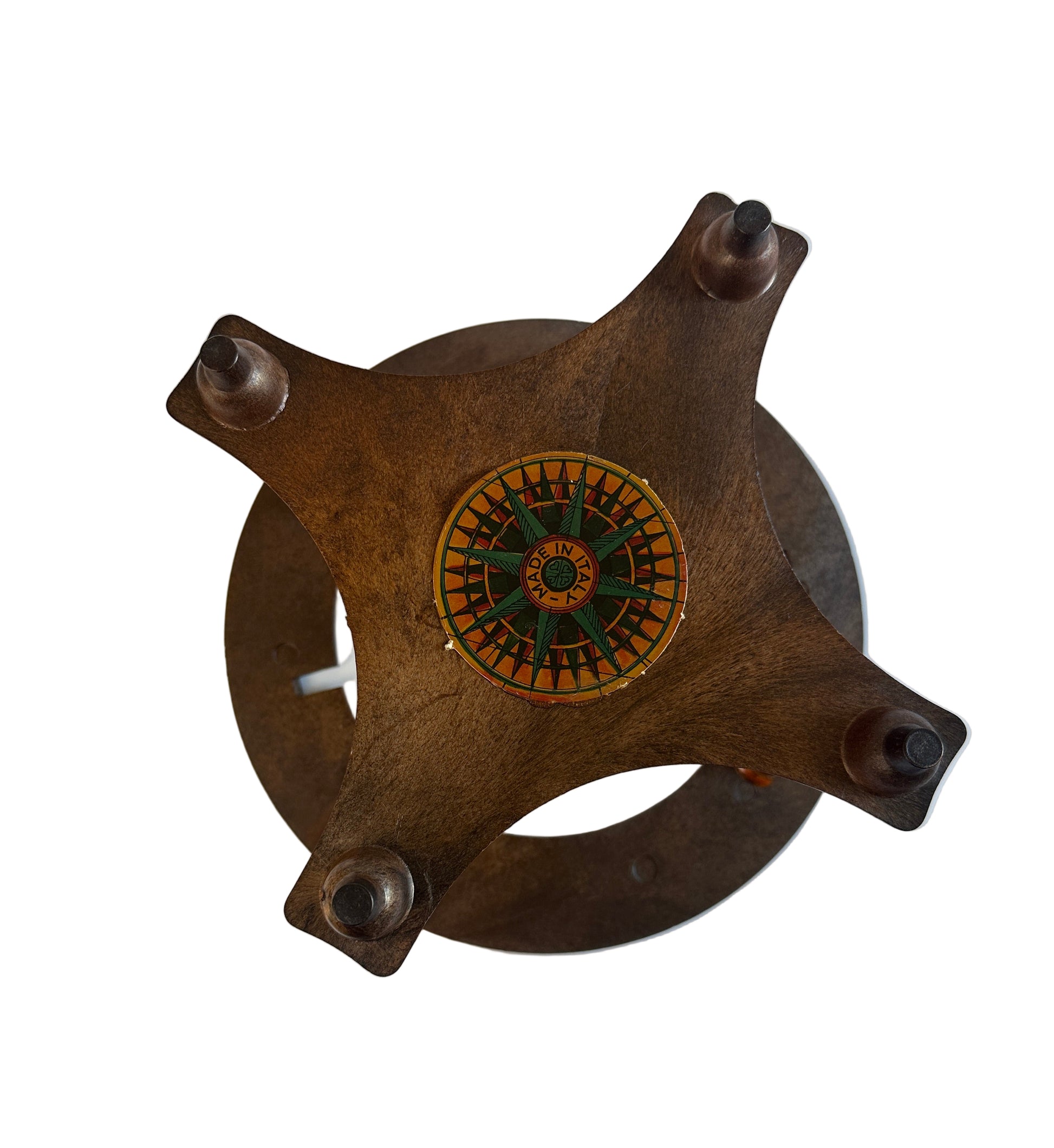 A charming vintage tabletop globe set in a traditional Old World style, featuring richly toned cartography with warm ochre, olive, and sepia hues. The globe sits within a printed wooden meridian ring and matching horizon band, both detailed with Latin zonal markings and delicate decorative motifs. Its base is crafted from turned wooden columns connected to a curved, four-footed platform, giving the piece a timeless library-desk feel. A beautiful accent for a study, office, or bookshelf equal parts decorative and nostalgic.